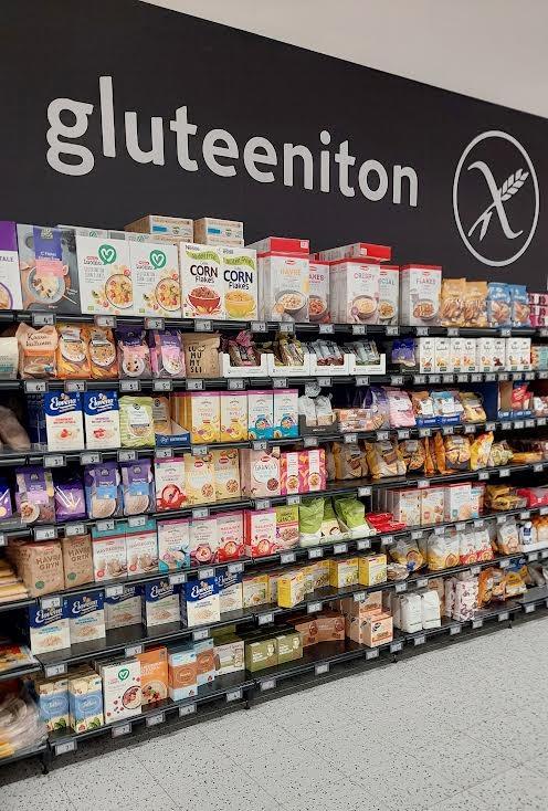 Kauhavan uusi Supermarket avattiin lokakuussa. Esillä mahtava gluteeniton tarjonta, ei paljoa häviä Citymarketeille. Tämän hyllyn lisäksi erillinen tuoreleipäosasto.