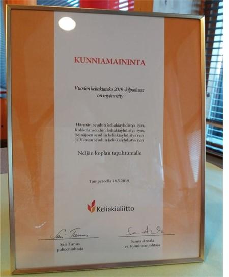 Neljän koplan yhteistyö on saanut Keliakialiiton kuunniamaininnan v. 2019